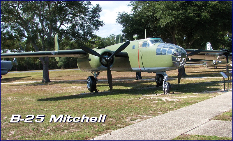 The North American B-25 "Mitchell" Bomber was one of the most versatile and widely used aircraft and considered the best medium bomber of the Second World War. Over 11,000 were produced with a wide number of variations and armament configurations.The short-field takeoff and landing characteristics of the B-25, its ruggedness, ease of maintenance and field modifications under combat conditions for different combat needs, resulted in the B-25 eventually replacing the Martin B-26 Marauder as the medium bomber of choice in the Pacific. (Courtesy: Mid-Atlantic Air Museum) |